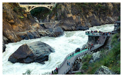 Tiger Leaping Gorge, also known as Hutiao Gorge, loacted about 100 kilometers northwest of Lijiang Old Town lying between Jade Dragon Snow Mountain and Haba Snow Mountain, is one of the deepest gorges in the world. From the top of the gorge you look down the steeply angled (70-90 degrees) mountain sides to the rushing Golden Sands (Jinsha) River with its 18 frothing rapids more than 200 meters below.