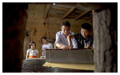 With over one thousand years history, the local ancient villagers started to use bamboo for hand-made paper making in the Song Dynasty (908-1227). The hand-made paper, was called Gushan Court Paper, has long fiber length and is preserved for decades. The paper surface is new, not damp and not easy to break. It is especially suitable for painting and calligraphy, and has the advantage that machine paper is irreplaceable. Known as the “tribute paper”,the Daoguanchong Village's bamboo paper was used by the court in the period of Emperor Qianlong during the Qing Dynasty(1644-1911).